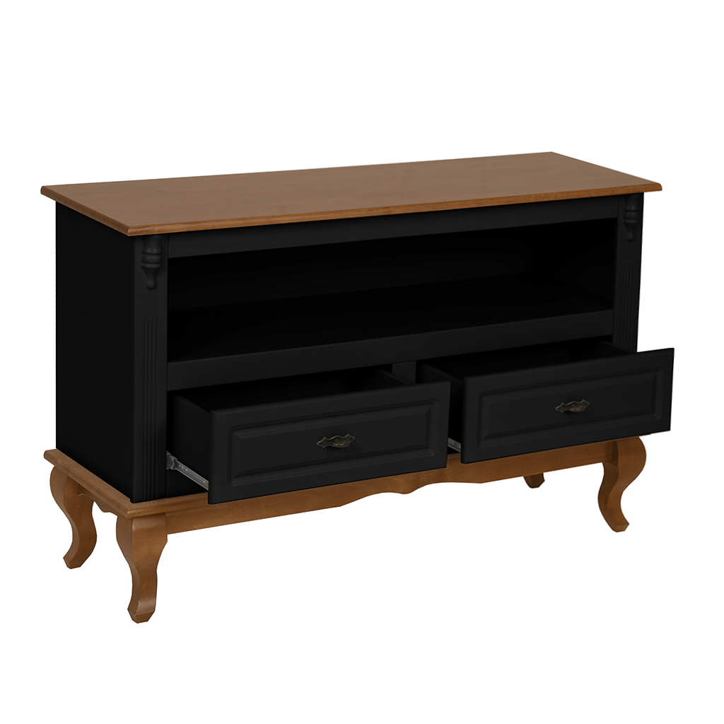 O Rack Florença 2 Gavetas 1 Nicho vai ajudar a compor um ambiente aconchegante e único com a combinação de mdf e madeira maciça, além disso, conta com pés no modelo Luiz XV, que dão um toque de elegância à peça